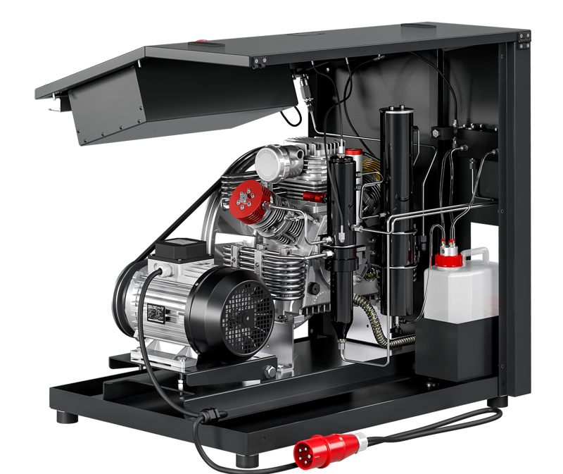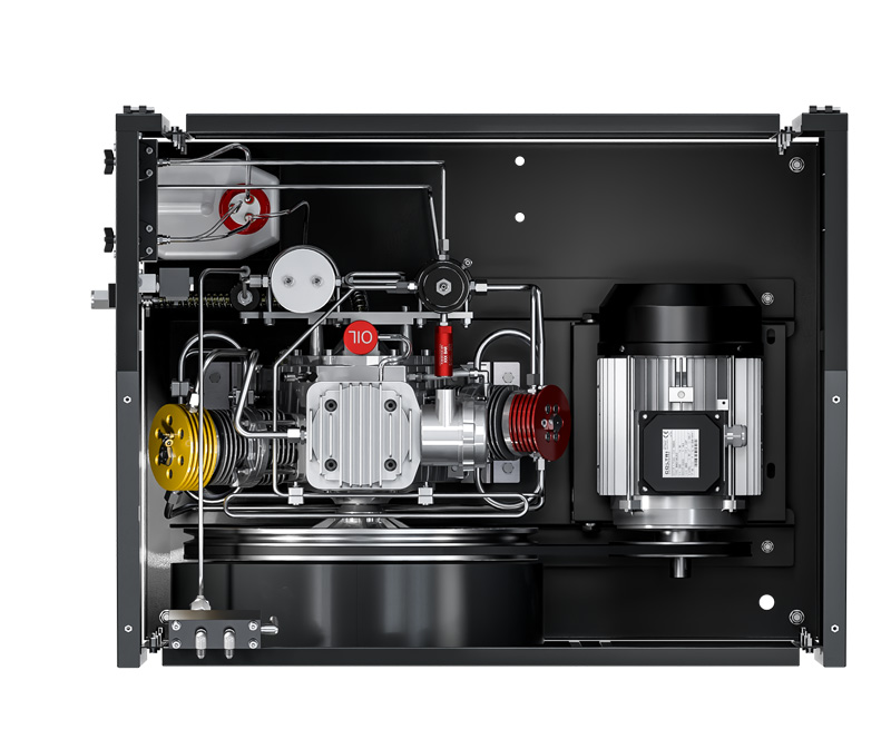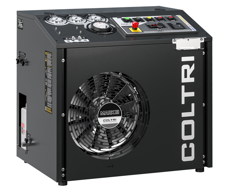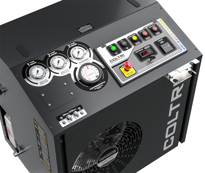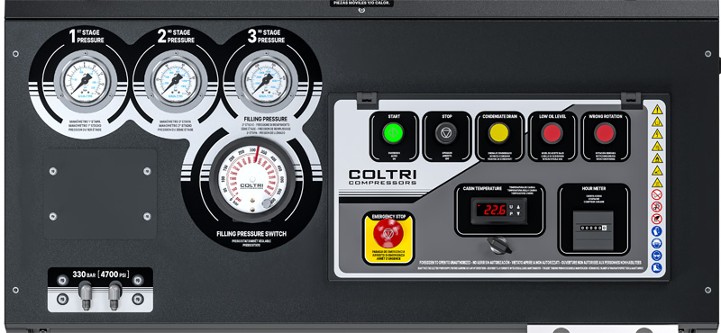 Powered by a three-phase 230V electric motor, this Coltri Efficient line compressor has a monitoring system panel that includes an interstage pressure gauge, autostop with adjustable pressure switch, automatic condensate drain and a phase control for rotation direction. Control is everything. Designed with control systems that allow effective monitoring of operations: interstage pressure, oil level, cabin internal temperature and direction of rotation detector. 3 Stage high – pressure pumping unit.